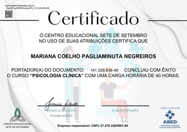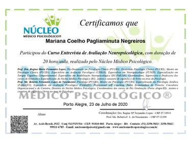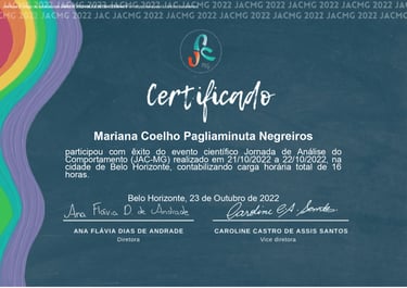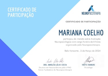 Prazer, eu sou a Mariana Coelho Pagliaminuta Negreiros, Psicóloga (CRP-04/77555), Graduada em Psicologia pela PUC Minas. Atuo com Avaliação Neuropsicológica e Psicoterapia, sendo especializada no atendimento de autistas adultos, com foco em Mulheres no Espectro.