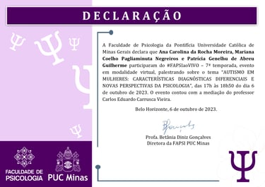 O sucesso foi tão grande que fomos convidadas para palestrar em outras unidades da PUC Minas. Posteriormente, também fomos chamadas a fazer uma live no canal oficial da Faculdade de Psicologia da PUC Minas, abordando o Autismo em Mulheres.